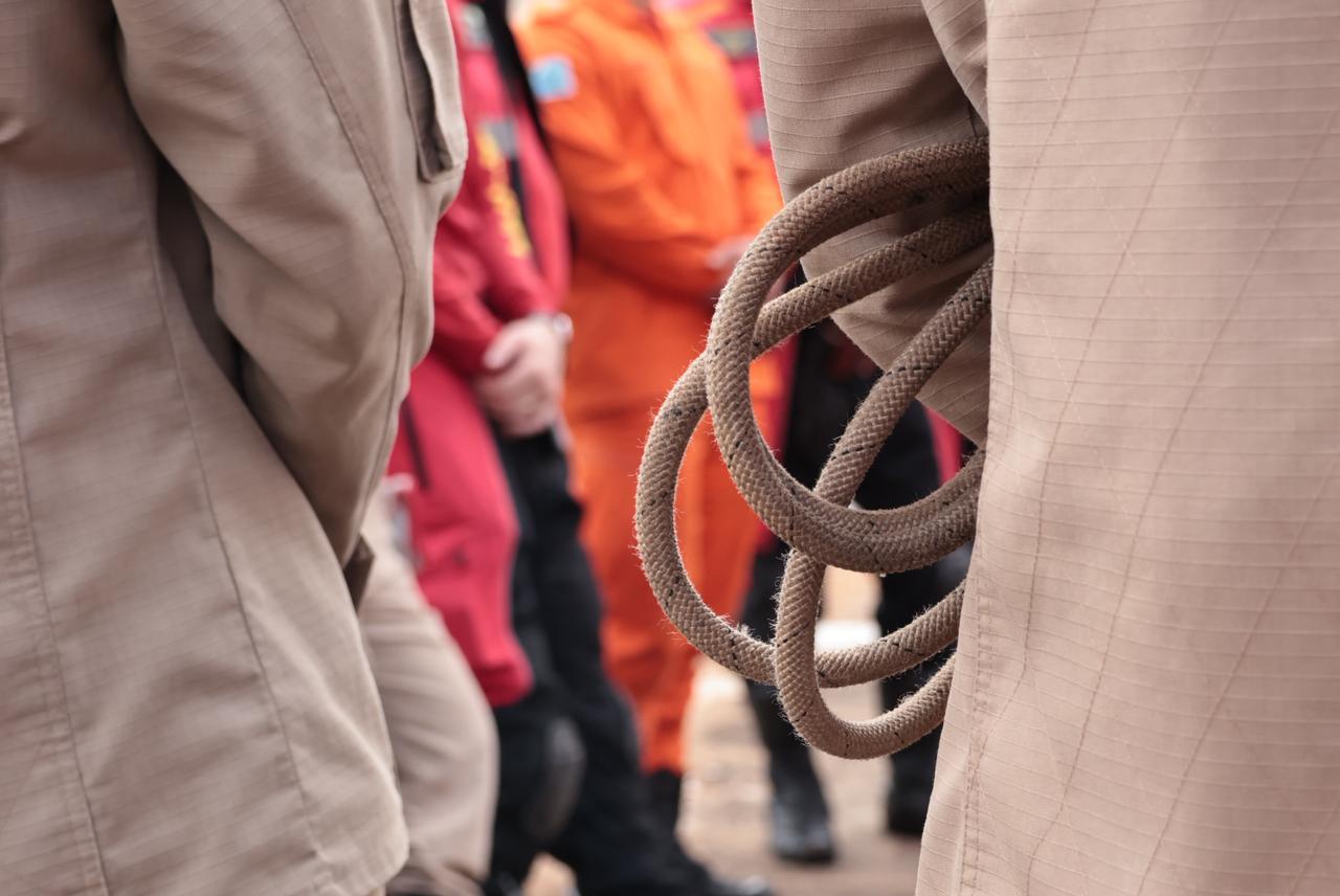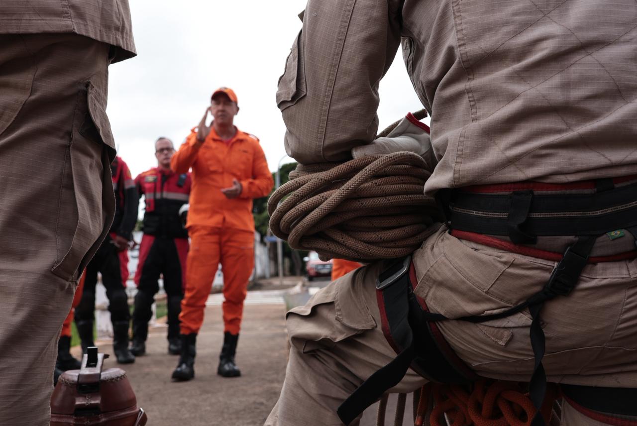 “A simulação era de dois homens em uma moto, cujo condutor perdeu o controle e ambos caíram no córrego. Então, foi usada toda a técnica de salvamento para descer a prancha e içar as vítimas com uso de cordas e todo o equipamento de segurança”, explica o capitão Araújo, do CBMMS, responsável pelo treinamento.